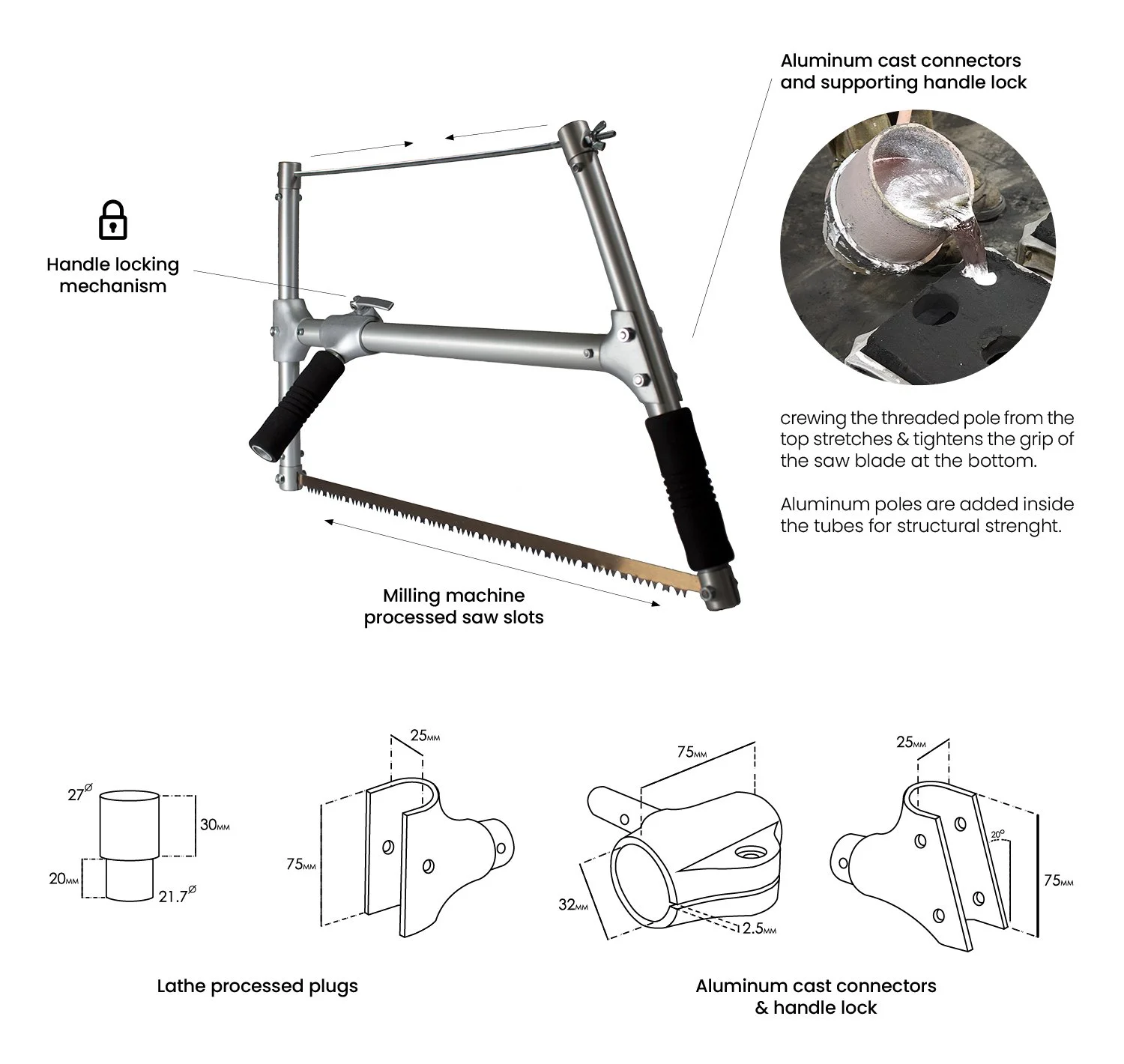 This project explores the functionality of the traditional bow saw, examining how it can be adapted to aluminum through modern production technologies. It investigates the material's limits and behavior in this context.